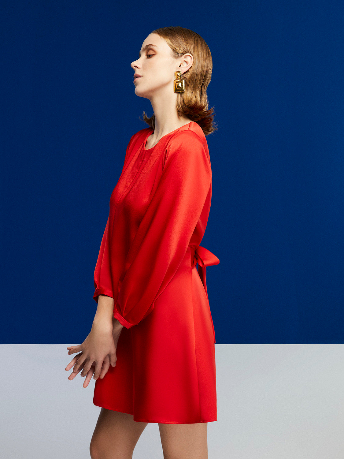 Crew-neck dress with below-the-elbow length sleeves and self-belt. Back zipper closure.